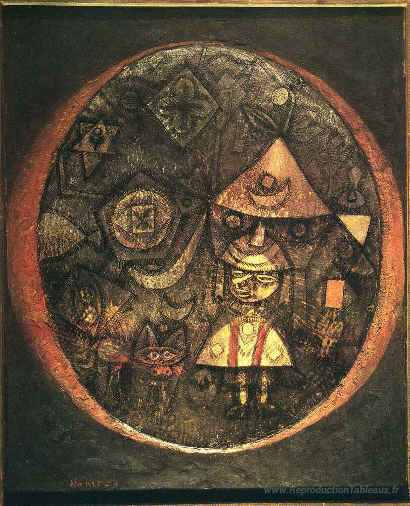 Nous vous proposons une reproduction artisanale sur toile du célèbre tableau 'Conte de fées du nain' de Paul Klee, provenant du Musée de la Reproduction.