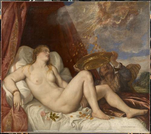 Nous vous proposons une reproduction artisanale sur toile du célèbre tableau 'Danae' de Titian, provenant du Musée de la Reproduction.