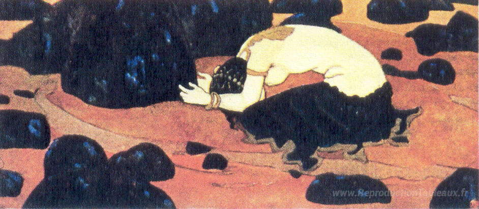 Nous vous proposons une reproduction artisanale sur toile du célèbre tableau 'Devassari Abuntu se transforme en pierre' de Nicholas Roerich, provenant du Musée de la Reproduction.