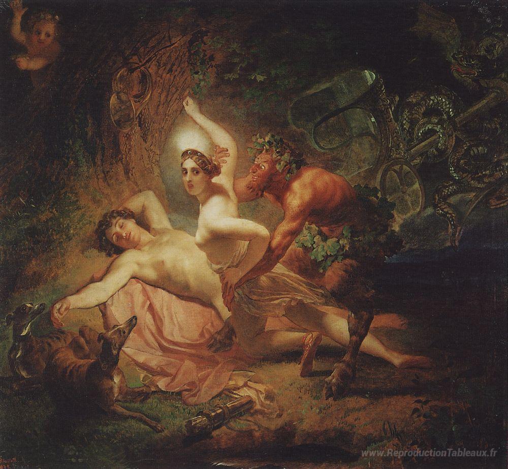 Nous vous proposons une reproduction artisanale sur toile du célèbre tableau 'Diana, endymion et satyre' de Karl Bryullov, provenant du Musée de la Reproduction.