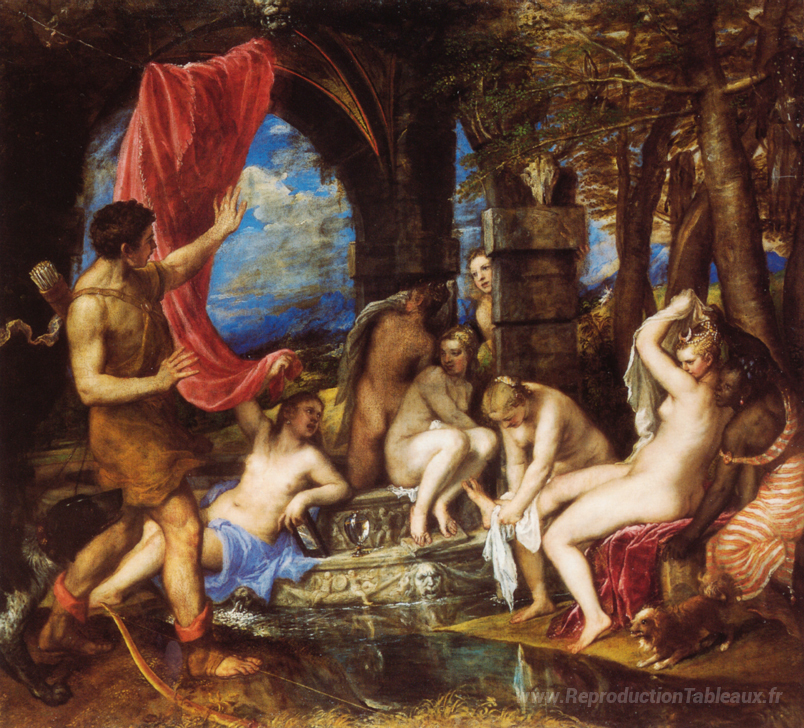 Nous vous proposons une reproduction artisanale sur toile du célèbre tableau 'Diana et Actaeon' de Titian, provenant du Musée de la Reproduction.