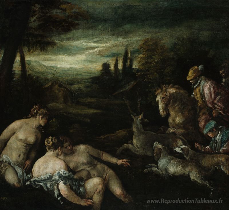 Nous vous proposons une reproduction artisanale sur toile du célèbre tableau 'Diana et Actaeon' de Jacopo Bassano, provenant du Musée de la Reproduction.