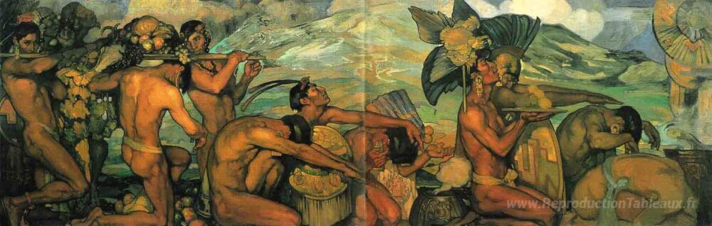 Nous vous proposons une reproduction artisanale sur toile du célèbre tableau 'Dioses nuestros' de Saturnino Herran, provenant du Musée de la Reproduction.