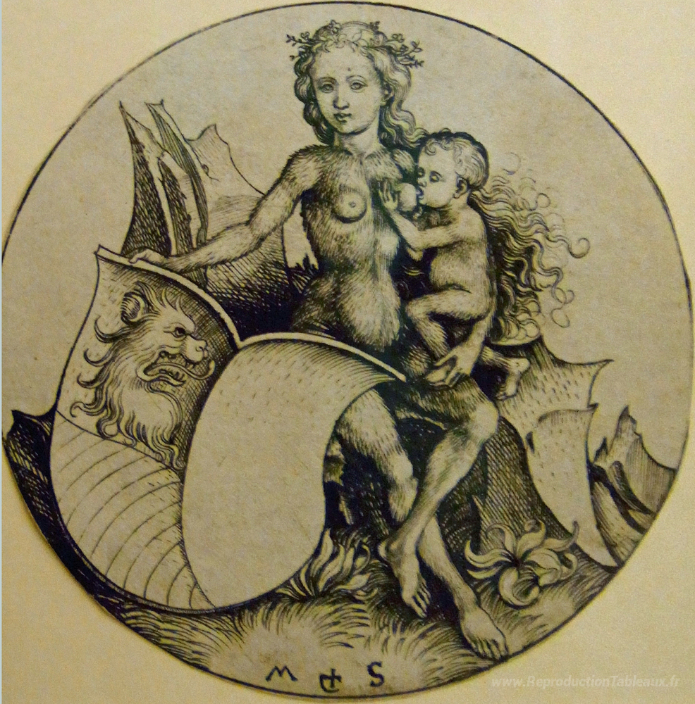 Nous vous proposons une reproduction artisanale sur toile du célèbre tableau 'Femme sauvage avec bouclier' de Martin Schongauer, provenant du Musée de la Reproduction.