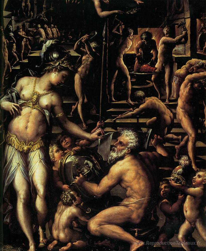 Nous vous proposons une reproduction artisanale sur toile du célèbre tableau 'Fornace di Vulcano' de Giorgio Vasari, provenant du Musée de la Reproduction.