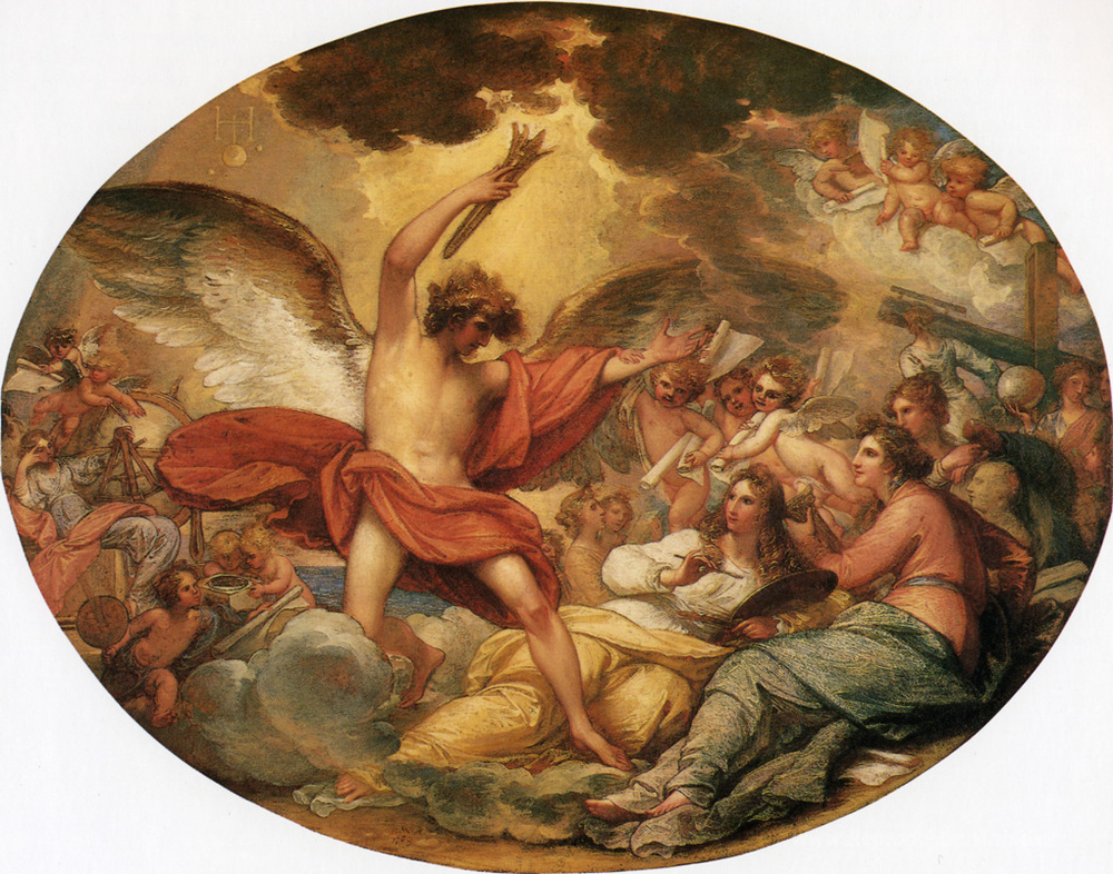 Nous vous proposons une reproduction artisanale sur toile du célèbre tableau 'Génie appelant les beaux-arts à orner les fabricants et le comme' de Benjamin West, provenant du Musée de la Reproduction.