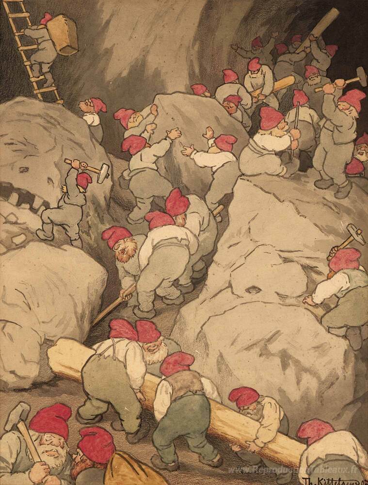 Nous vous proposons une reproduction artisanale sur toile du célèbre tableau 'I Tomtegruvan' de Theodor Severin Kittelsen, provenant du Musée de la Reproduction.