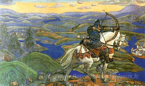Nous vous proposons une reproduction artisanale sur toile du célèbre tableau 'Il'ja Muromec' de Nicholas Roerich, provenant du Musée de la Reproduction.