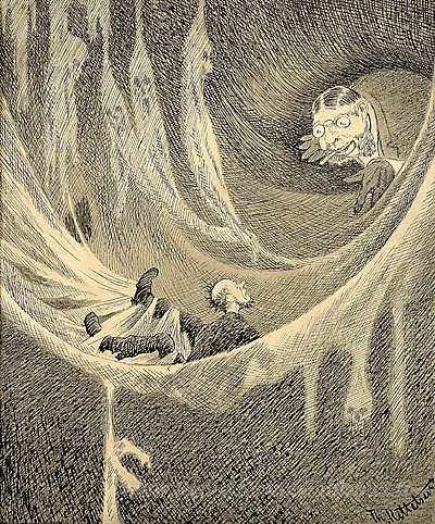Nous vous proposons une reproduction artisanale sur toile du célèbre tableau 'Je Spindelvevet' de Theodor Severin Kittelsen, provenant du Musée de la Reproduction.
