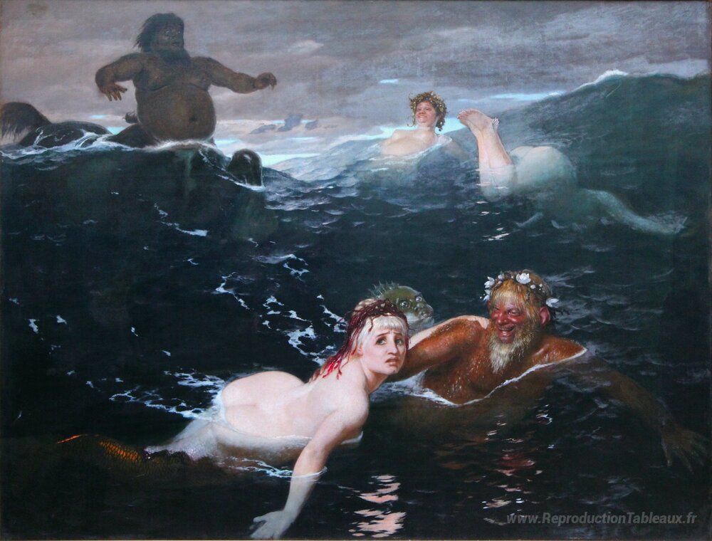 Nous vous proposons une reproduction artisanale sur toile du célèbre tableau 'Jouer dans les vagues' de Arnold Böcklin, provenant du Musée de la Reproduction.