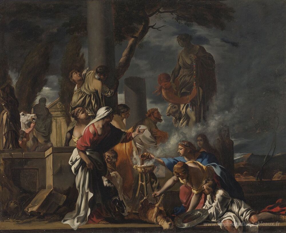 Nous vous proposons une reproduction artisanale sur toile du célèbre tableau 'King Salomon sacrifiant aux idoles' de Sebastien Bourdon, provenant du Musée de la Reproduction.