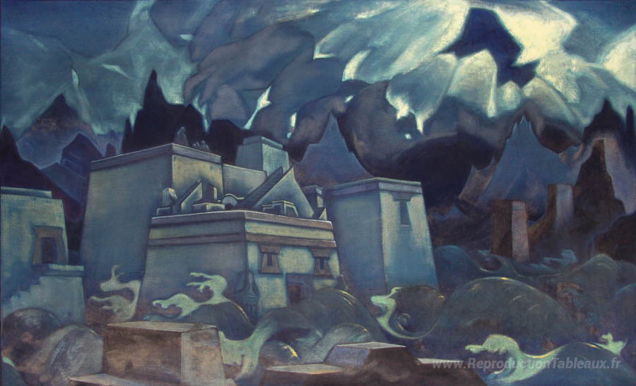 Nous vous proposons une reproduction artisanale sur toile du célèbre tableau 'La destruction de l'Atlantis' de Nicholas Roerich, provenant du Musée de la Reproduction.