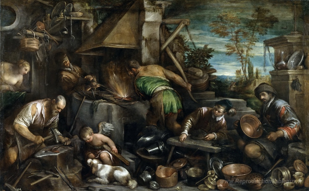 Nous vous proposons une reproduction artisanale sur toile du célèbre tableau 'La forge de Vulcain' de Jacopo Bassano, provenant du Musée de la Reproduction.