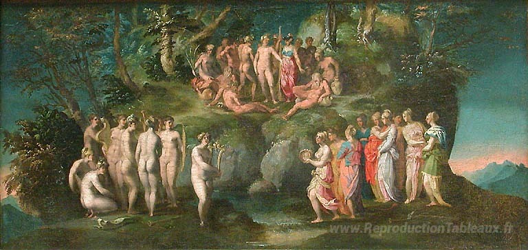 Nous vous proposons une reproduction artisanale sur toile du célèbre tableau 'Le défi des Pierrides' de Rosso Fiorentino, provenant du Musée de la Reproduction.