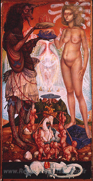 Nous vous proposons une reproduction artisanale sur toile du célèbre tableau 'Le mariage de l'Unichorn' de Ernst Fuchs, provenant du Musée de la Reproduction.
