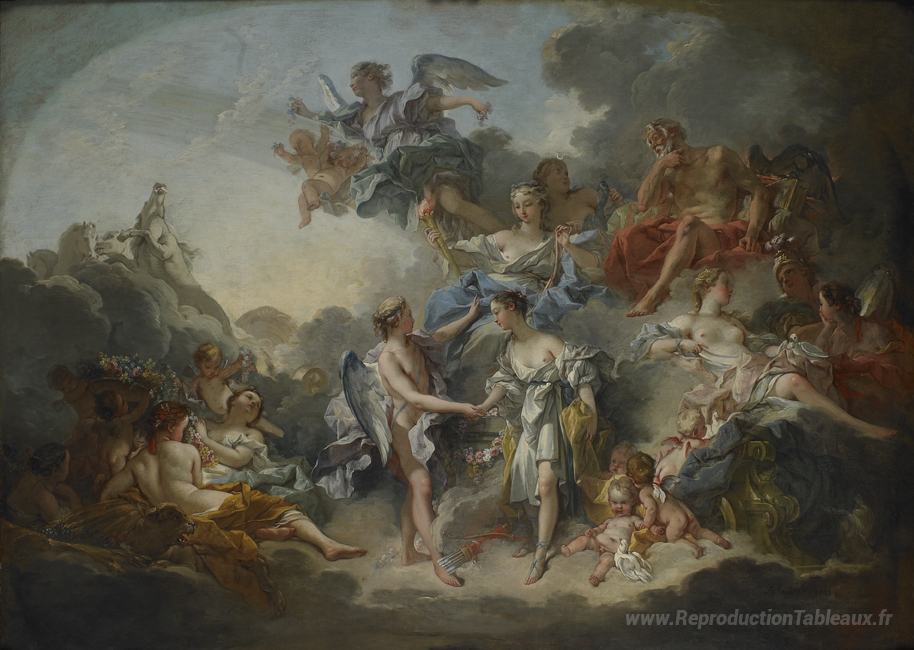 Nous vous proposons une reproduction artisanale sur toile du célèbre tableau 'Le mariage de psych et de l`amour' de Francois Boucher, provenant du Musée de la Reproduction.