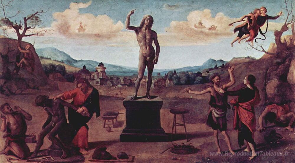 Nous vous proposons une reproduction artisanale sur toile du célèbre tableau 'Le mythe de Prometheus' de Piero di Cosimo, provenant du Musée de la Reproduction.