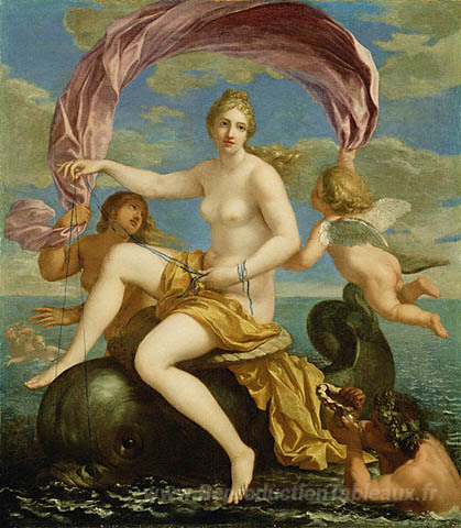 Nous vous proposons une reproduction artisanale sur toile du célèbre tableau 'Le triomphe de Galatea' de Jacques Stella, provenant du Musée de la Reproduction.