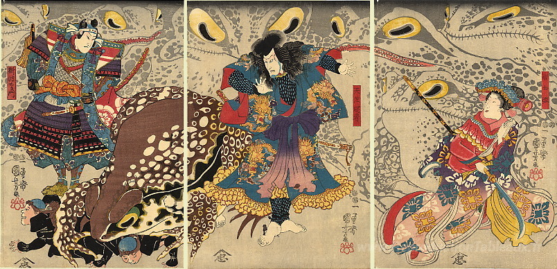 Nous vous proposons une reproduction artisanale sur toile du célèbre tableau 'Les crapauds magiques' de Utagawa Kuniyoshi, provenant du Musée de la Reproduction.