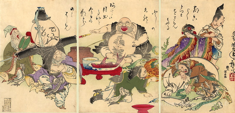 Nous vous proposons une reproduction artisanale sur toile du célèbre tableau 'Les sept dieux chanceux' de Tsukioka Yoshitoshi, provenant du Musée de la Reproduction.