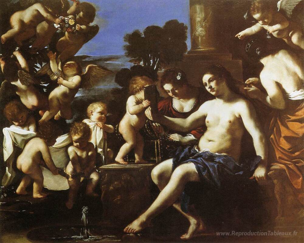 Nous vous proposons une reproduction artisanale sur toile du célèbre tableau 'Les toilettes de Vénus' de Guercino, provenant du Musée de la Reproduction.