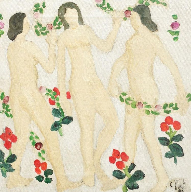 Nous vous proposons une reproduction artisanale sur toile du célèbre tableau 'Les trois grâces' de Constantin Piliuta, provenant du Musée de la Reproduction.