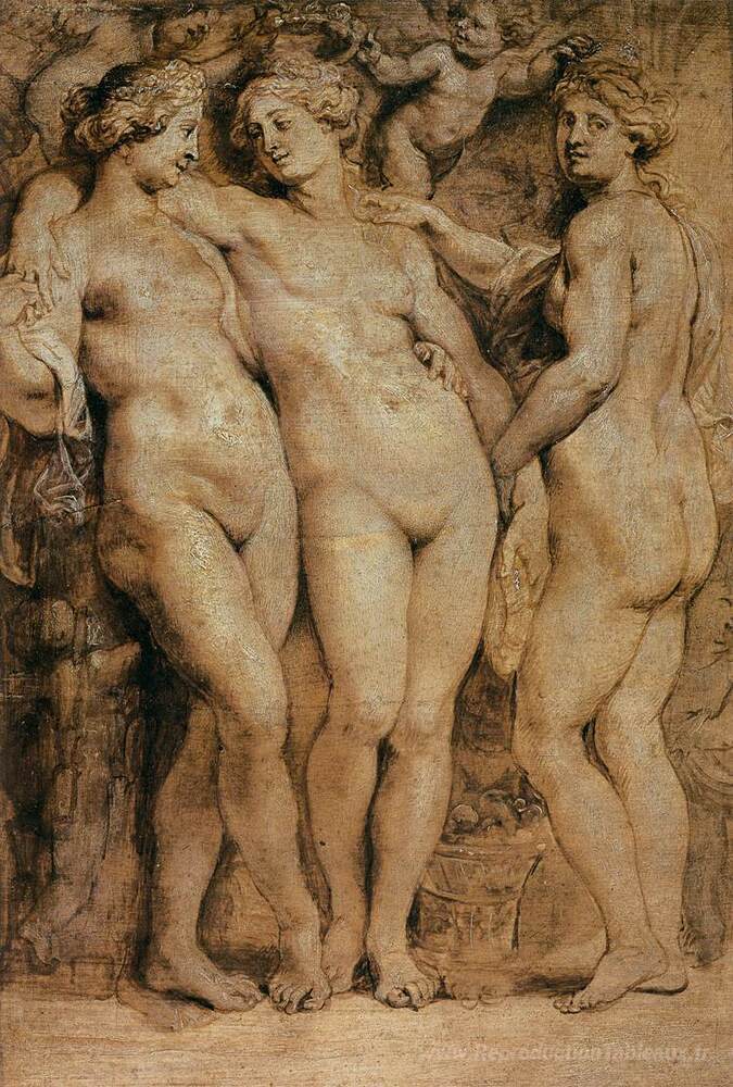 Nous vous proposons une reproduction artisanale sur toile du célèbre tableau 'Les trois grâces' de Peter Paul Rubens, provenant du Musée de la Reproduction.