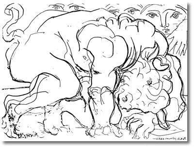 Nous vous proposons une reproduction artisanale sur toile du célèbre tableau 'Minotaure est blessé' de Pablo Picasso, provenant du Musée de la Reproduction.