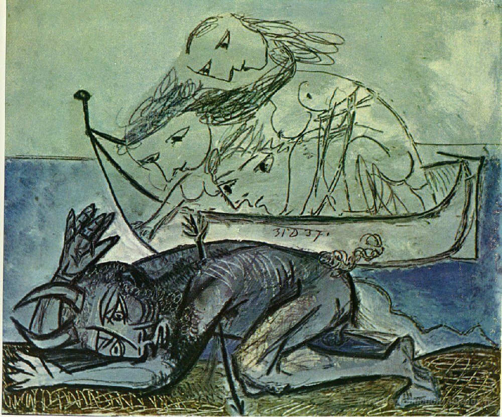 Nous vous proposons une reproduction artisanale sur toile du célèbre tableau 'Minotaure est blessé' de Pablo Picasso, provenant du Musée de la Reproduction.