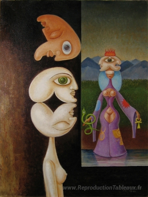 Nous vous proposons une reproduction artisanale sur toile du célèbre tableau 'Mythotonie' de Victor Brauner, provenant du Musée de la Reproduction.