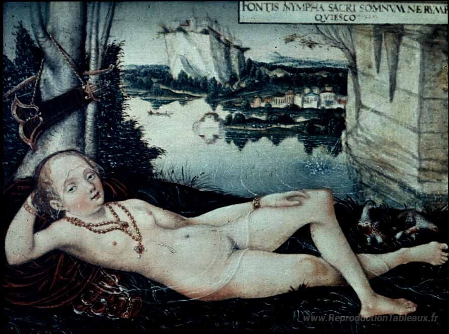 Nous vous proposons une reproduction artisanale sur toile du célèbre tableau 'Nymphe d'eau au repos' de Lucas Cranach the Elder, provenant du Musée de la Reproduction.