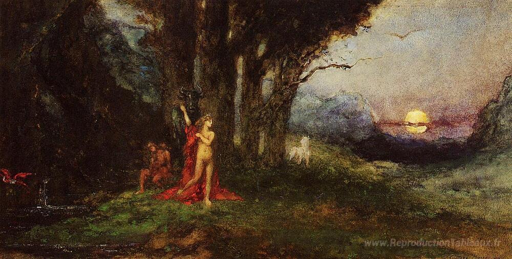Nous vous proposons une reproduction artisanale sur toile du célèbre tableau 'Pasiphae et le volume' de Gustave Moreau, provenant du Musée de la Reproduction.