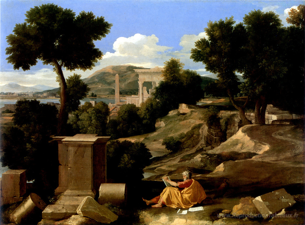 Nous vous proposons une reproduction artisanale sur toile du célèbre tableau 'Paysage avec St. James à Patmos' de Nicolas Poussin, provenant du Musée de la Reproduction.