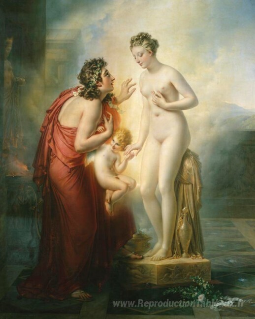 Nous vous proposons une reproduction artisanale sur toile du célèbre tableau 'Pygmalion et galatee' de Anne-Louis Girodet, provenant du Musée de la Reproduction.