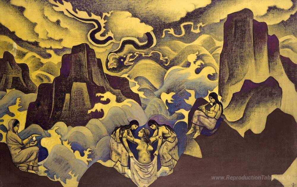 Nous vous proposons une reproduction artisanale sur toile du célèbre tableau 'Serpent ancien (serpent de sagesse)' de Nicholas Roerich, provenant du Musée de la Reproduction.