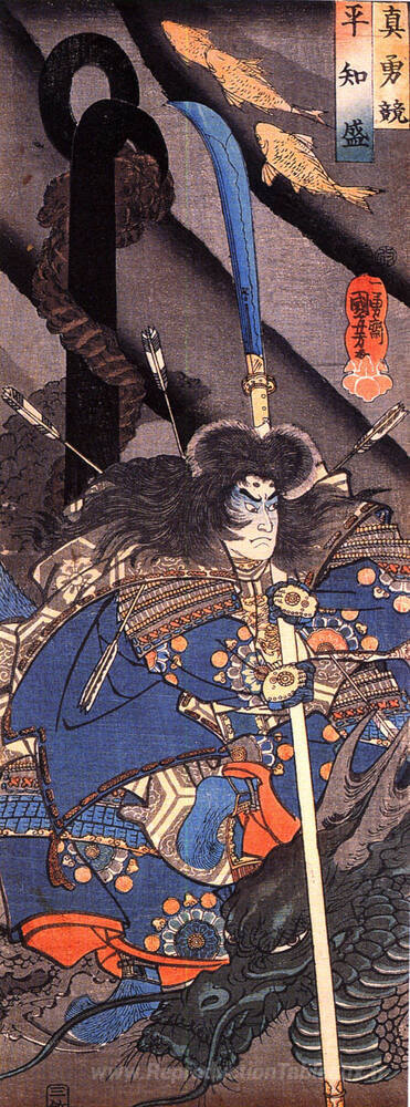 Nous vous proposons une reproduction artisanale sur toile du célèbre tableau 'Taira Tomomori et un dragon de mer' de Utagawa Kuniyoshi, provenant du Musée de la Reproduction.