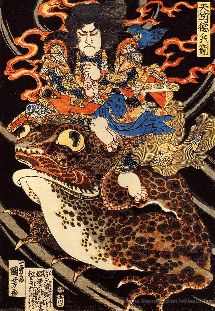 Nous vous proposons une reproduction artisanale sur toile du célèbre tableau 'Tenjiku tokubei chevauchant un crapaud géant' de Utagawa Kuniyoshi, provenant du Musée de la Reproduction.