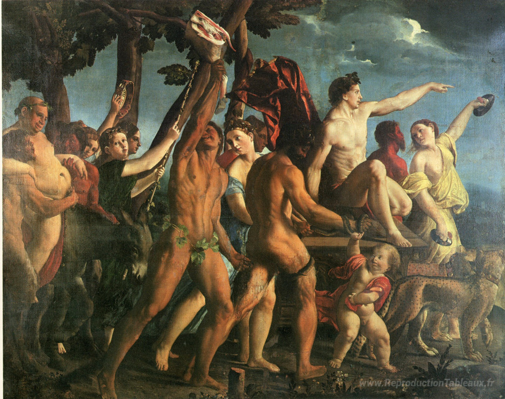 Nous vous proposons une reproduction artisanale sur toile du célèbre tableau 'Triomphe de Bacchus' de Dosso Dossi, provenant du Musée de la Reproduction.