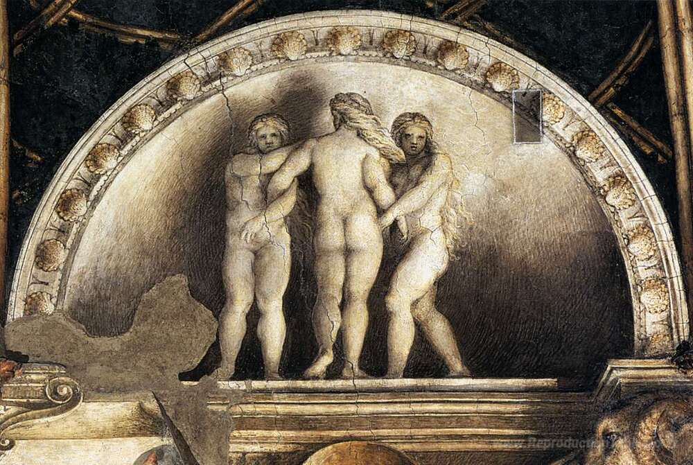 Nous vous proposons une reproduction artisanale sur toile du célèbre tableau 'Trois grâces' de Correggio, provenant du Musée de la Reproduction.