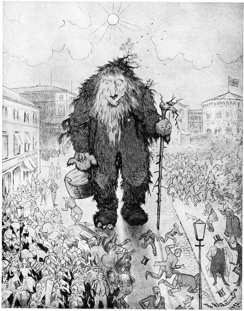 Nous vous proposons une reproduction artisanale sur toile du célèbre tableau 'Troll à la rue Karl Johan - Trollet På Karl Johan' de Theodor Severin Kittelsen, provenant du Musée de la Reproduction.