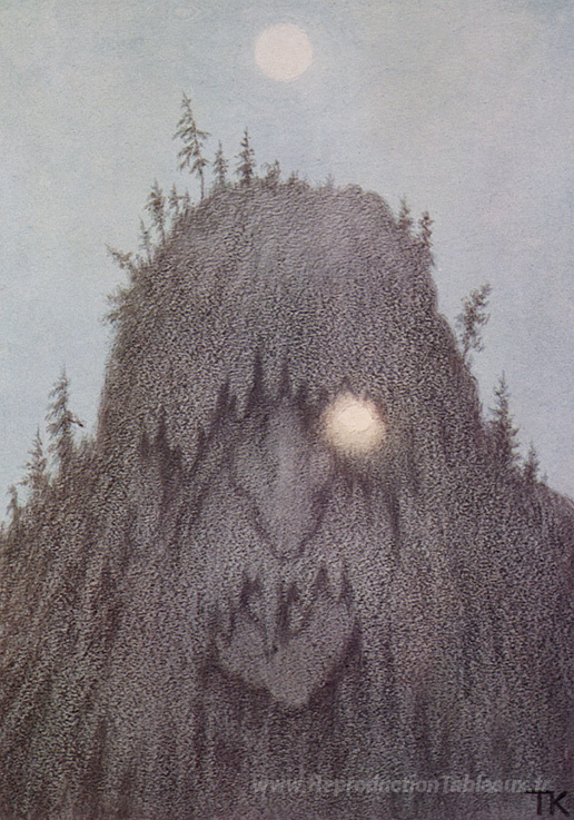 Nous vous proposons une reproduction artisanale sur toile du célèbre tableau 'Troll forestier' de Theodor Severin Kittelsen, provenant du Musée de la Reproduction.