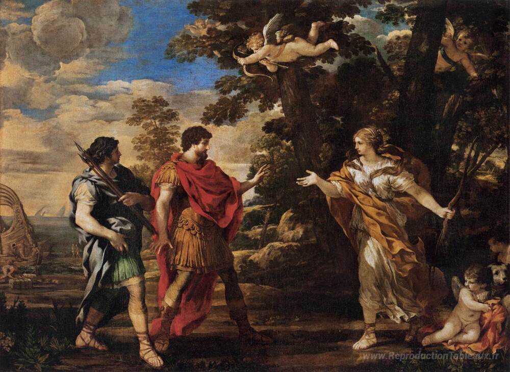 Nous vous proposons une reproduction artisanale sur toile du célèbre tableau 'Vénus apparaissant à Énée comme une chasseresse' de Pietro da Cortona, provenant du Musée de la Reproduction.