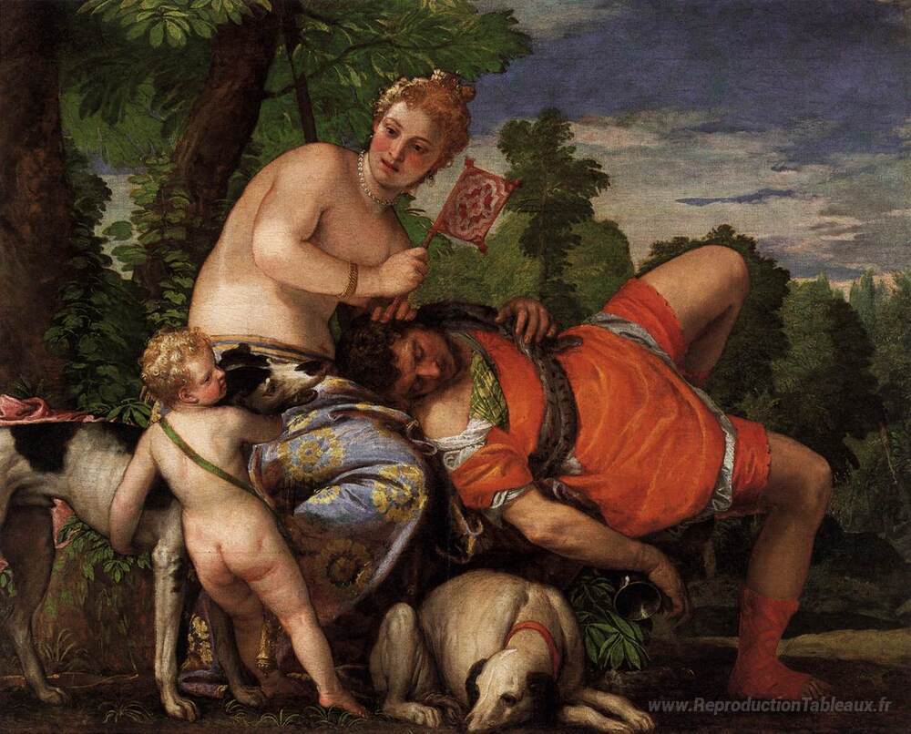 Nous vous proposons une reproduction artisanale sur toile du célèbre tableau 'Vénus et Adonis' de Paolo Veronese, provenant du Musée de la Reproduction.