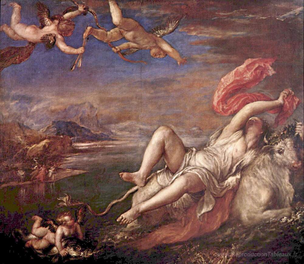 Nous vous proposons une reproduction artisanale sur toile du célèbre tableau 'Viol de l'Europe' de Titian, provenant du Musée de la Reproduction.