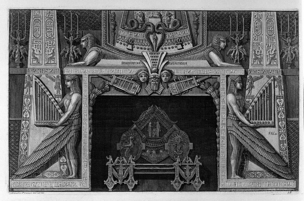 Nous vous proposons une reproduction artisanale sur toile du célèbre tableau 'Une cheminée de style égyptien surmonté de deux sphinx et flanqu' de Giovanni Battista Piranesi, provenant du Musée de la Reproduction.