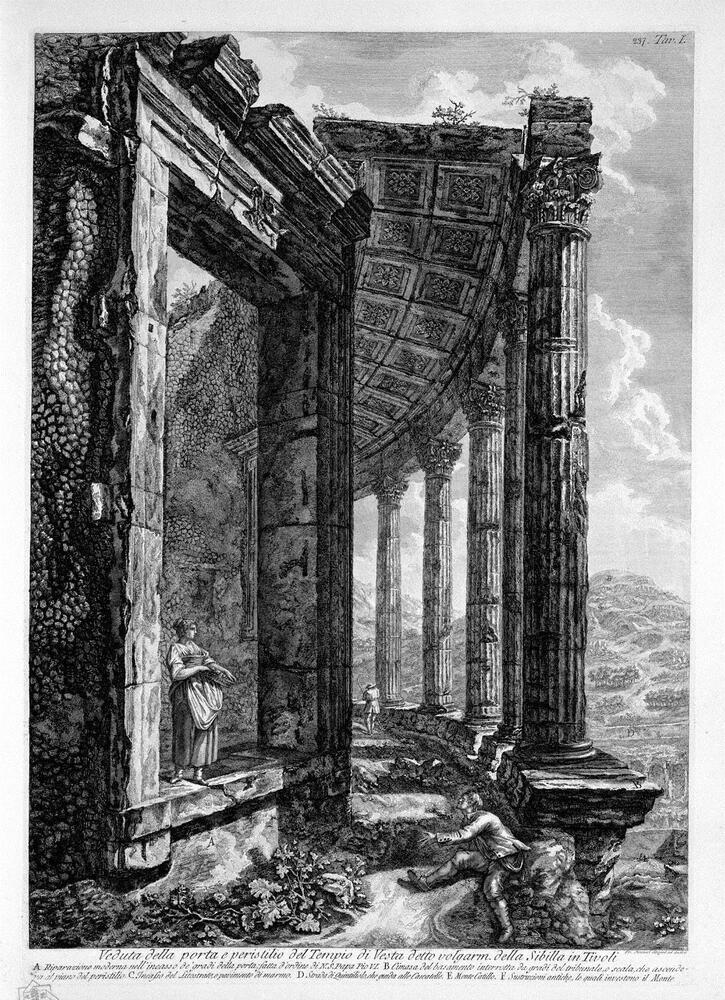 Nous vous proposons une reproduction artisanale sur toile du célèbre tableau 'Vue du péristyle et de la porte du temple de Vesta à Tivoli comm' de Giovanni Battista Piranesi, provenant du Musée de la Reproduction.