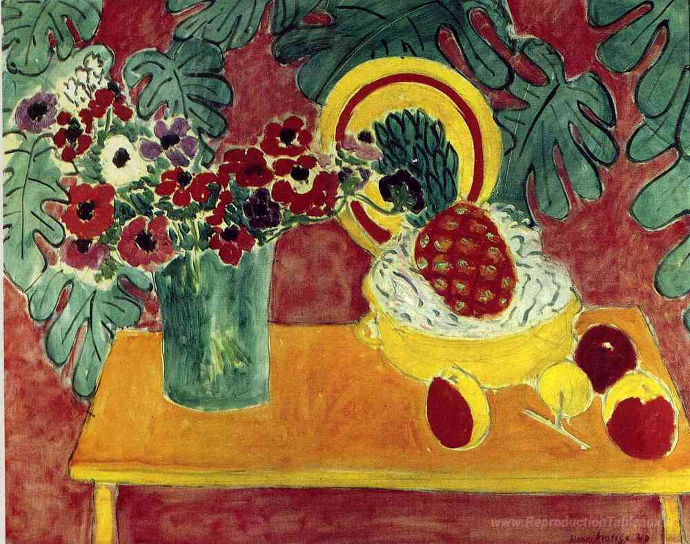 Nous vous proposons une reproduction artisanale sur toile du célèbre tableau 'Ananas et anémones' de Henri Matisse, provenant du Musée de la Reproduction.