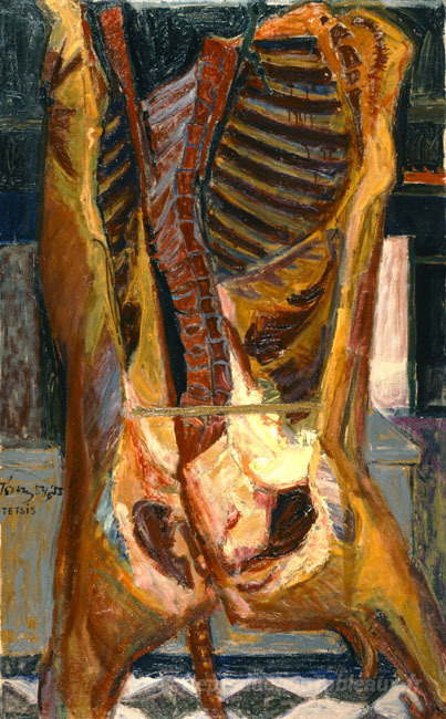 Nous vous proposons une reproduction artisanale sur toile du célèbre tableau 'Animal abattu' de Panayiotis Tetsis, provenant du Musée de la Reproduction.