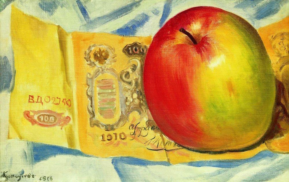 Nous vous proposons une reproduction artisanale sur toile du célèbre tableau 'Apple et la note de cent rues' de Boris Kustodiev, provenant du Musée de la Reproduction.