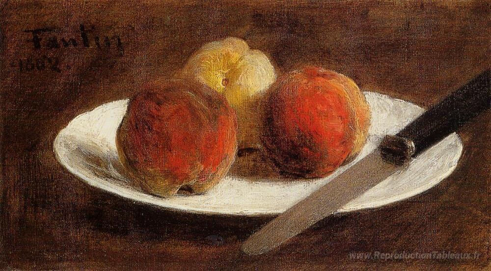 Nous vous proposons une reproduction artisanale sur toile du célèbre tableau 'Assiette de pêches' de Henri Fantin-Latour, provenant du Musée de la Reproduction.